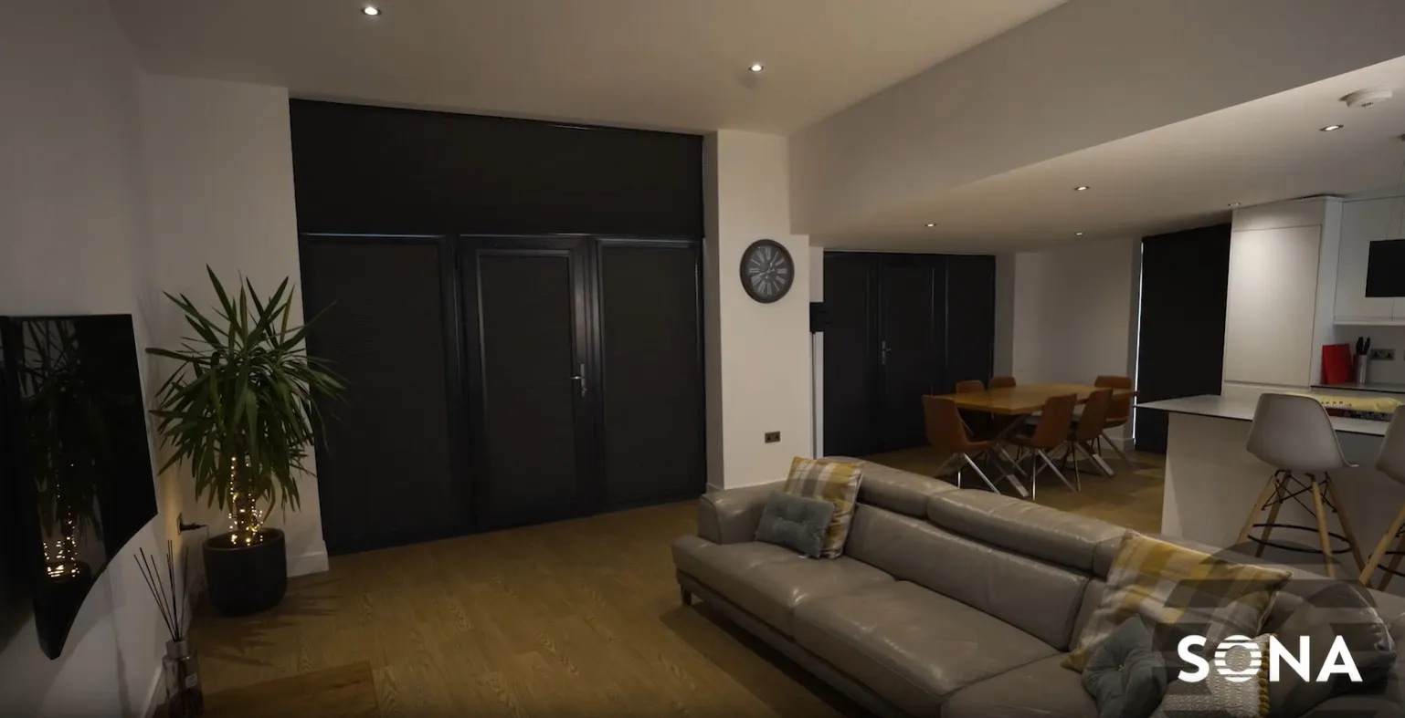 We engineered our SonaCell with Honeycell 25mm blackout cellular fabric, in combination with our Somfy remote-control 12v electric motors and accompanied by a hard wired mains power supply. All the blinds were connected to wireless RTS wall switches and a Somfy Tahoma Switch smart hub. The blinds also were complimented by a Perfect Fit International framework system in anthracite grey 7016. The blinds are almost ‘hidden’ when not in use and blend seamlessly into the bi-fold door and window frames, which allows the guests to focus on the beautiful countryside view. Have you checked out our flat roof window blind.