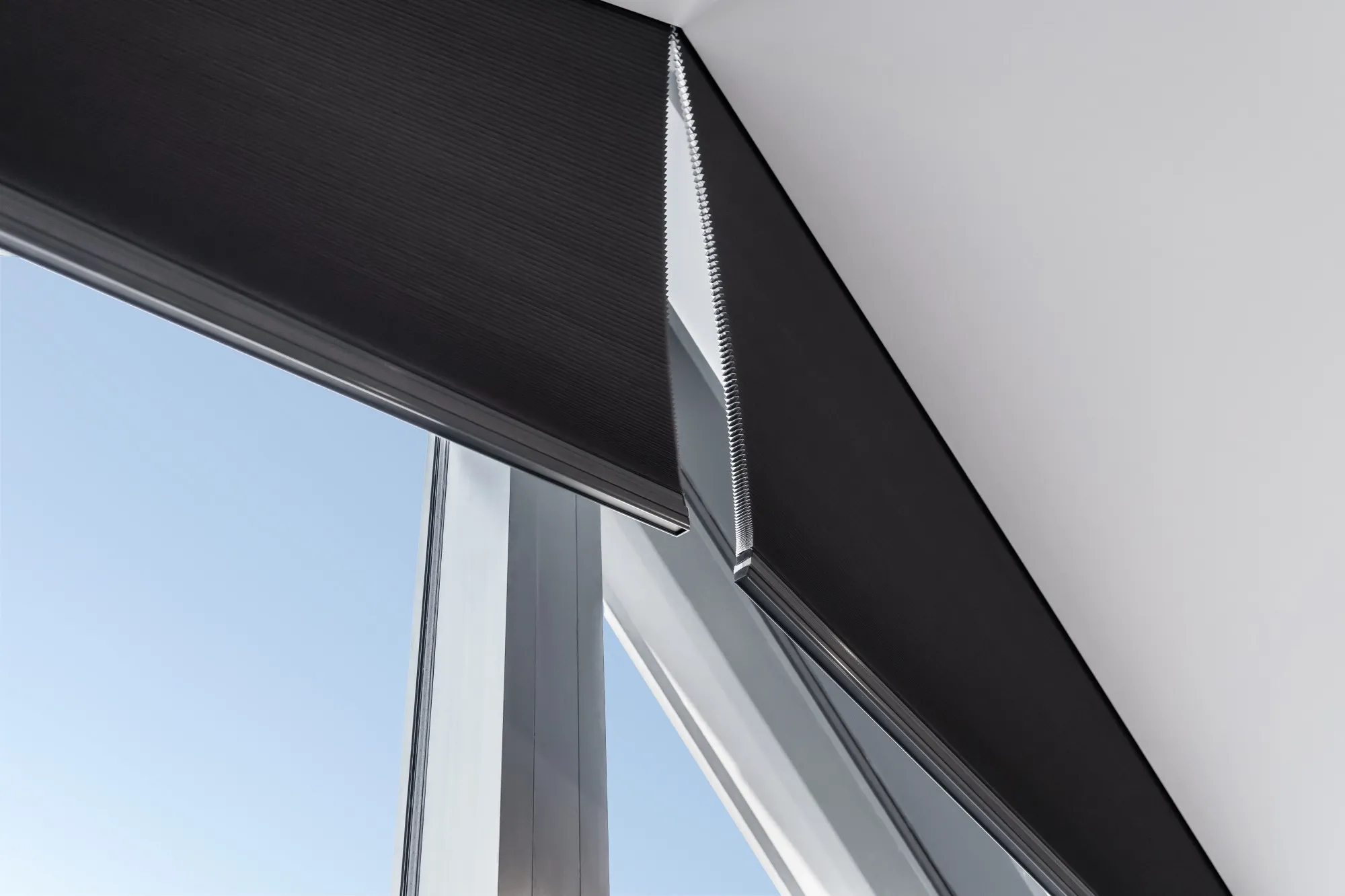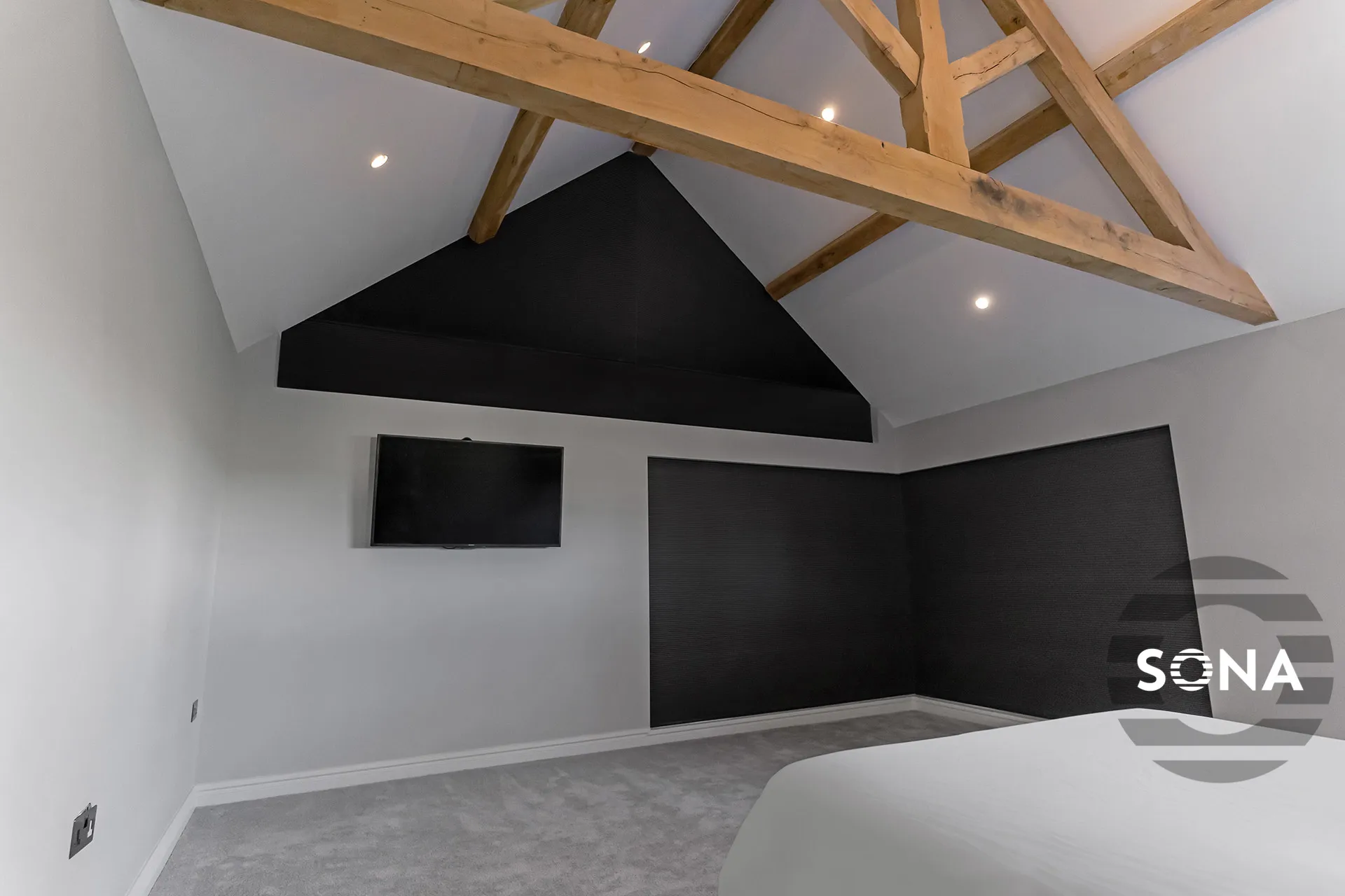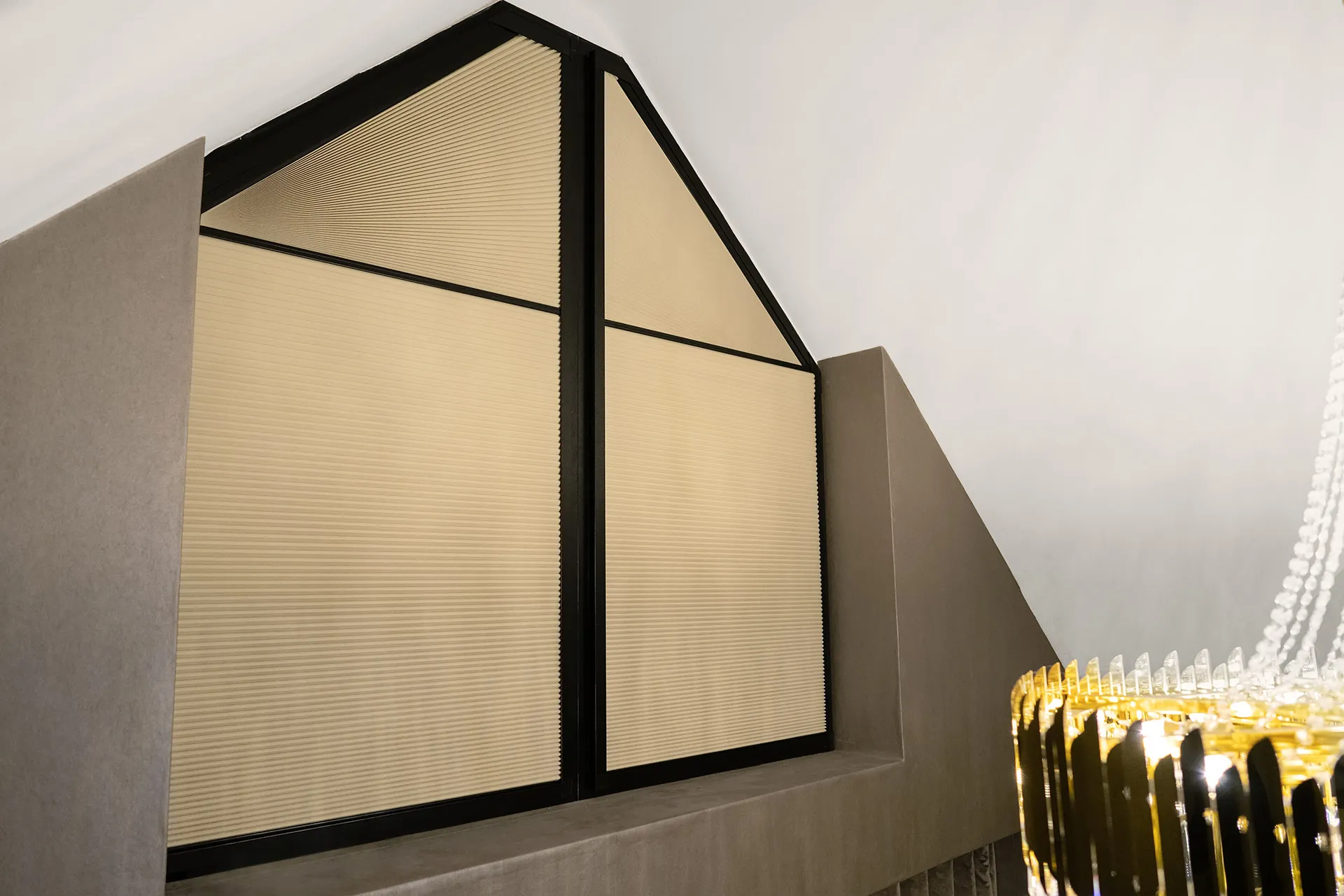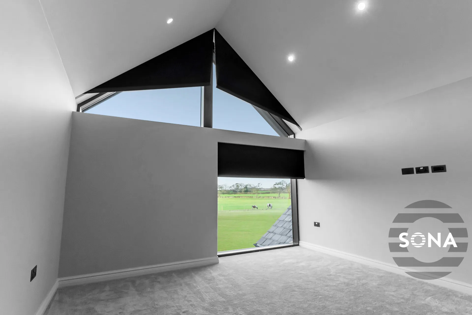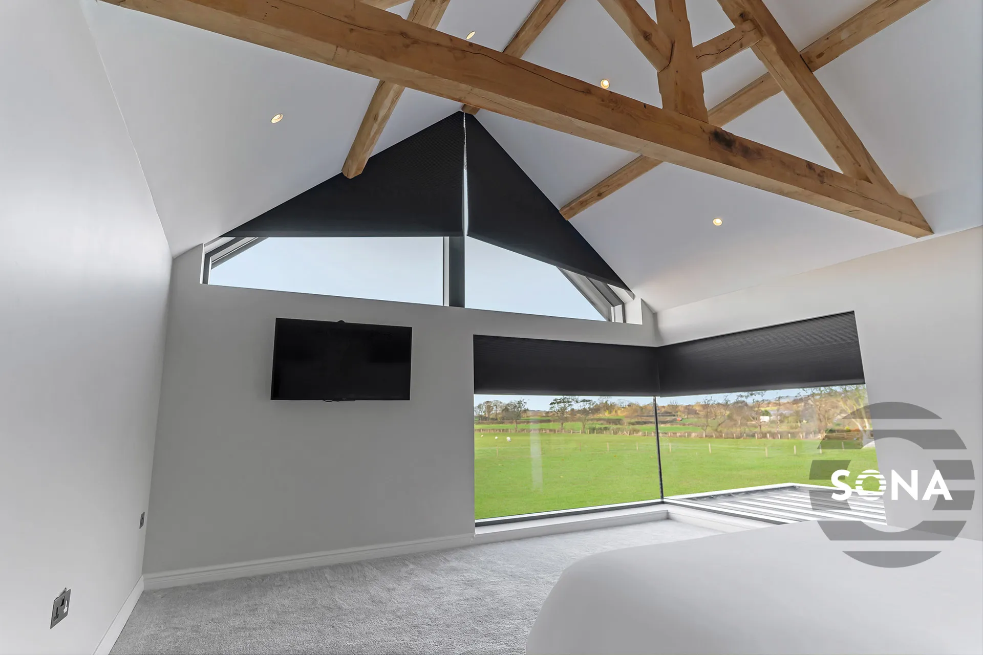 We manufactured our SonaApex and SonaCell blinds with Honeycell 25mm blackout cellular fabric, in combination with our Somfy remote-control 12v electric motors and a hard wired mains power supply system. All the blinds were connected to wireless RTS multi channel handsets to give individual blind control. We also powder coated the hardware on the blinds to match the window finish of anthracite grey 7016. The shaped blinds are almost ‘hidden’ when not in use and blend seamlessly into gable recess, which helps allow the maximum daylight into the room.