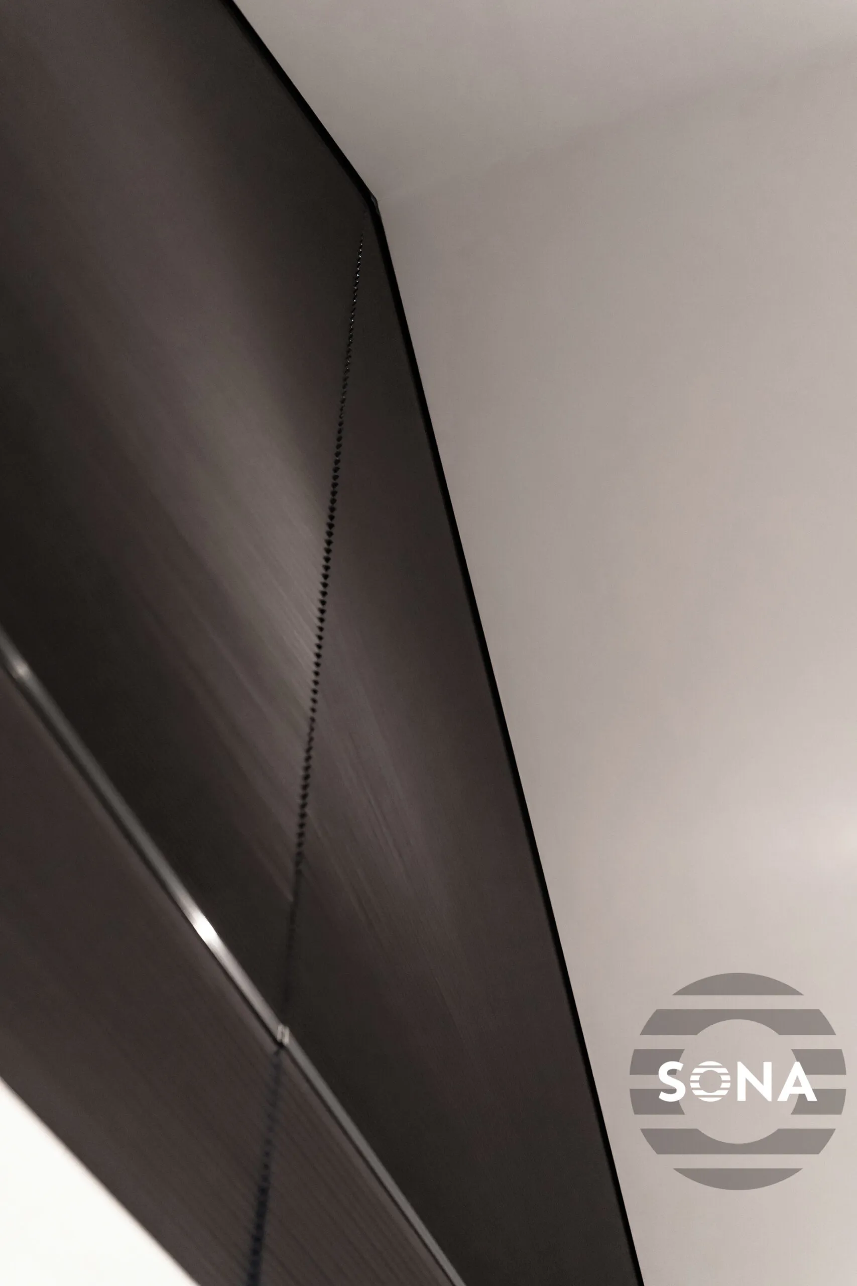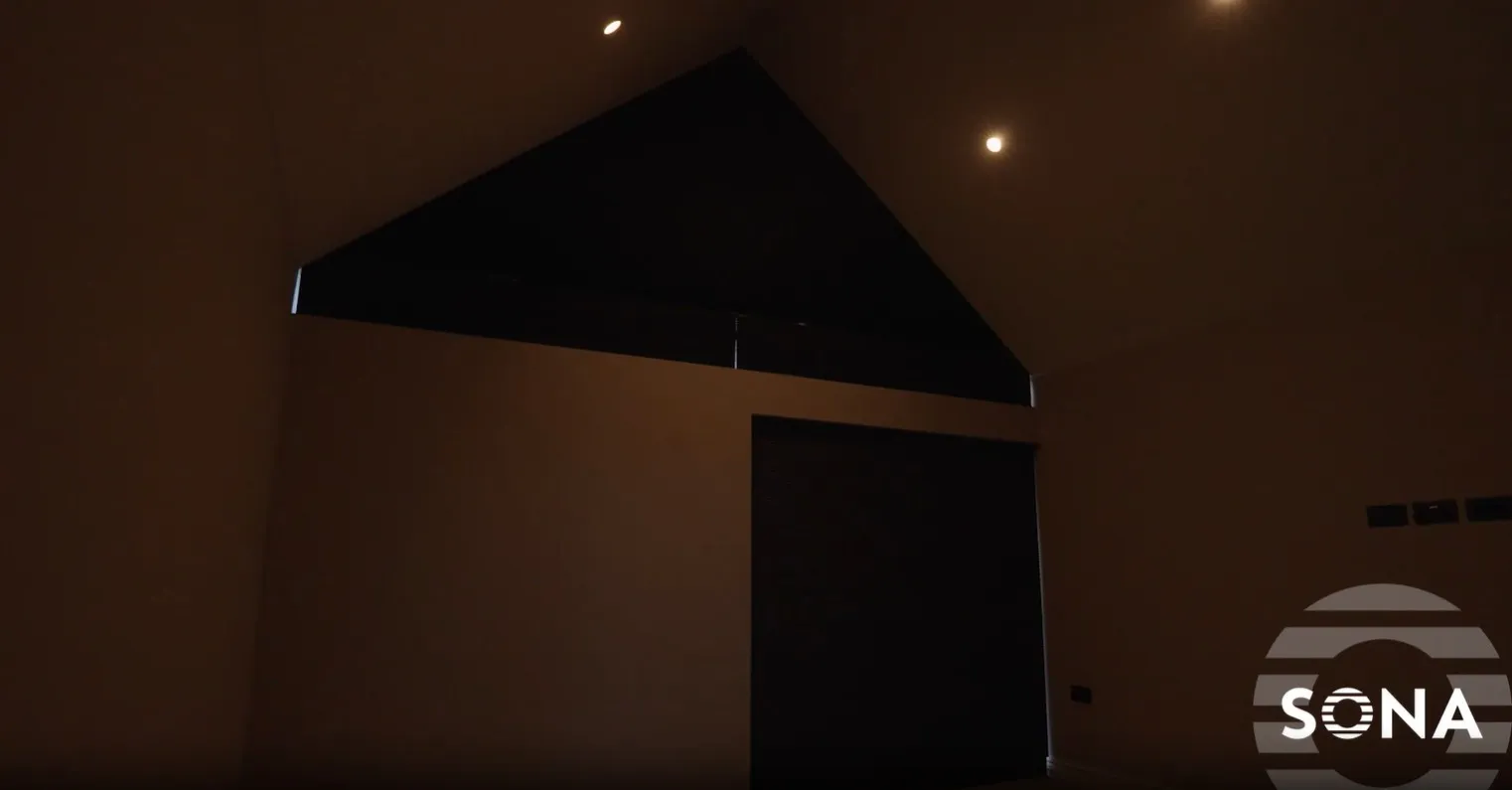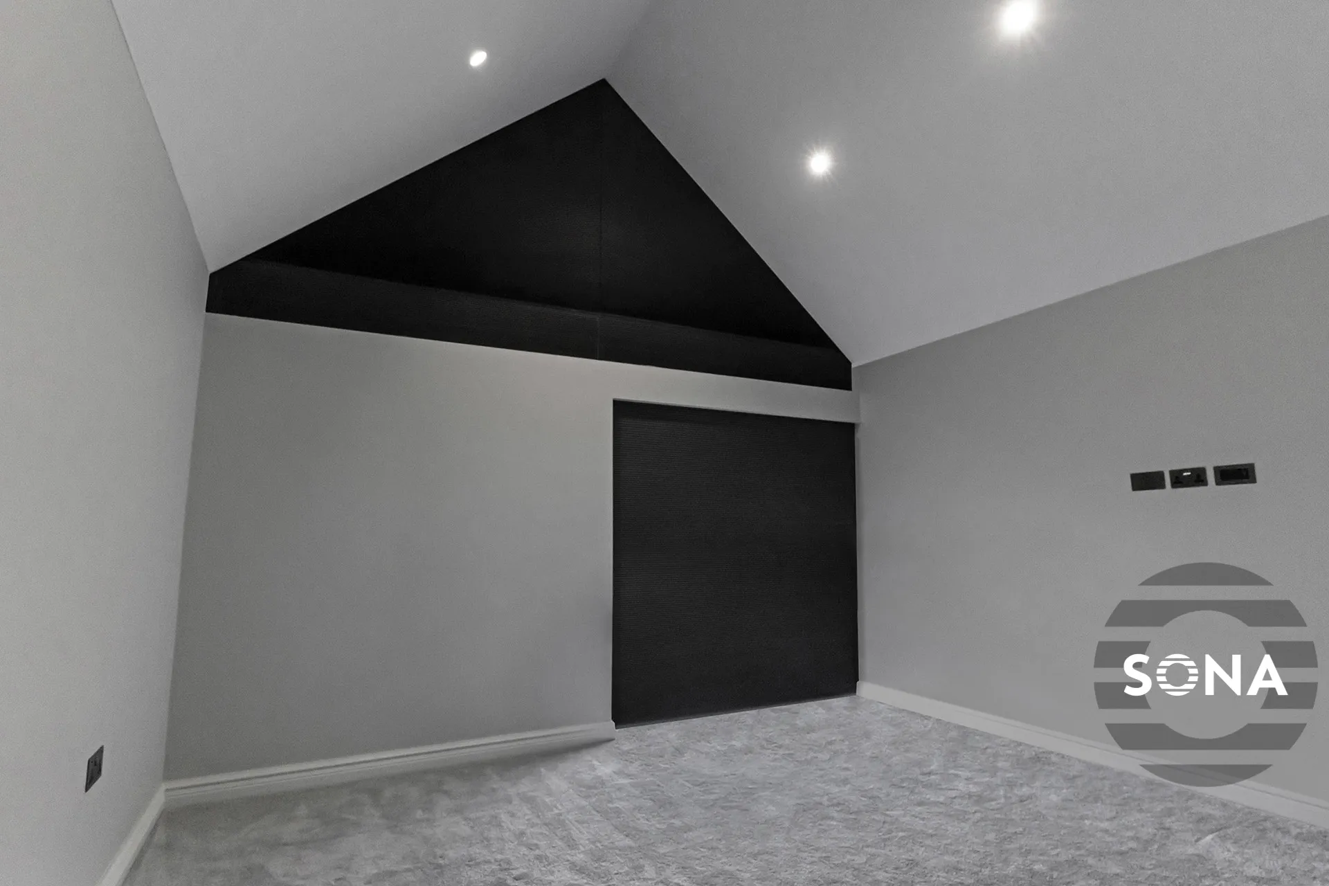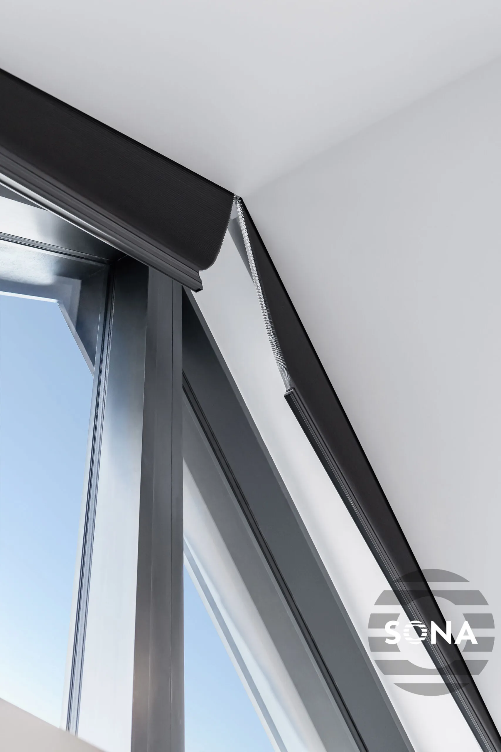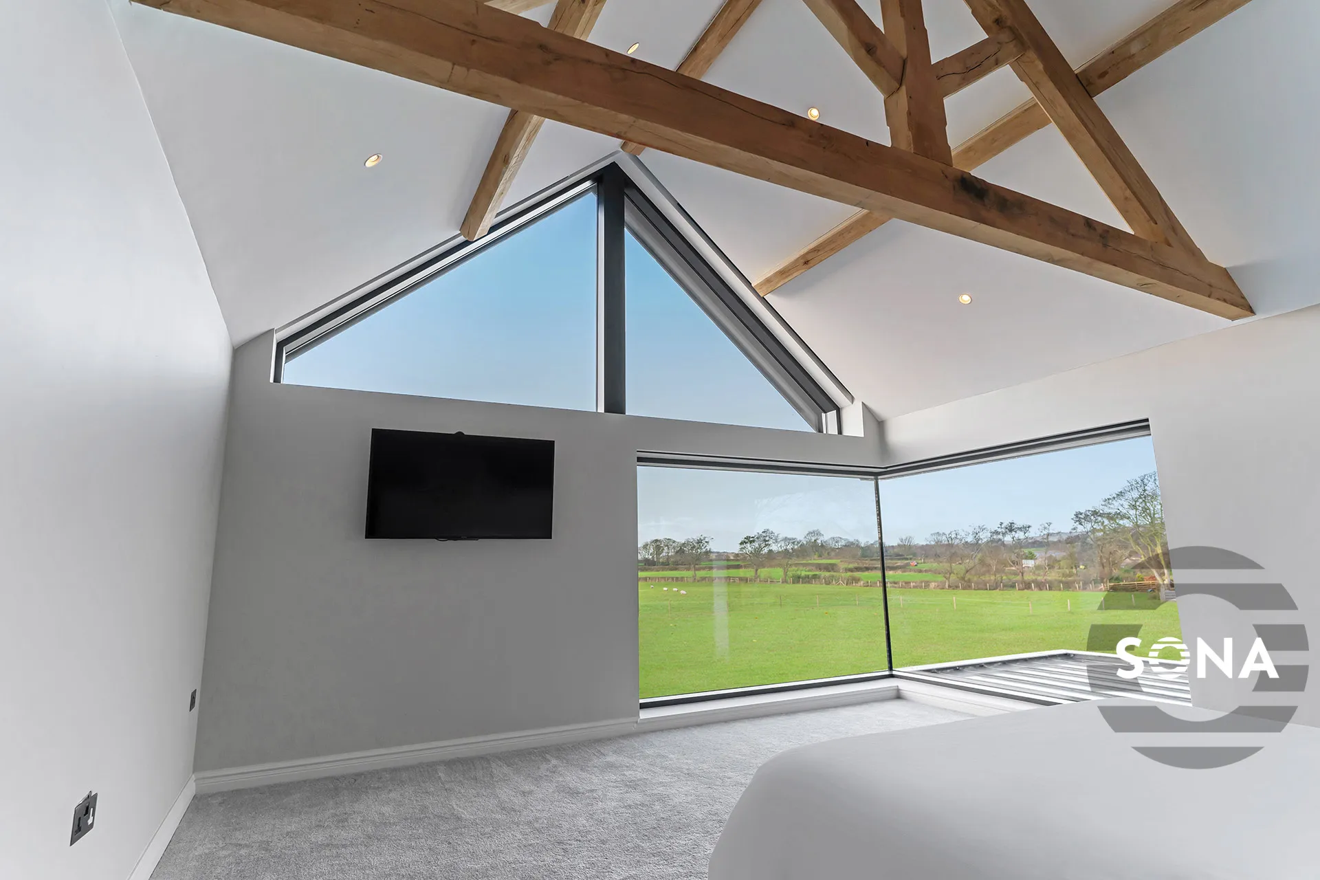 We manufactured our SonaApex and SonaCell blinds with Honeycell 25mm blackout cellular fabric, in combination with our Somfy remote-control 12v electric motors and a hard wired mains power supply system. All the blinds were connected to wireless RTS multi channel handsets to give individual blind control. We also powder coated the hardware on the blinds to match the window finish of anthracite grey 7016. The shaped blinds are almost ‘hidden’ when not in use and blend seamlessly into gable recess, which helps allow the maximum daylight into the room.