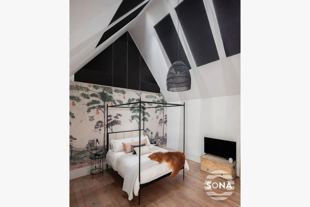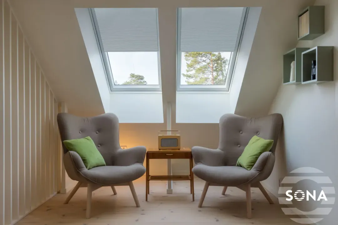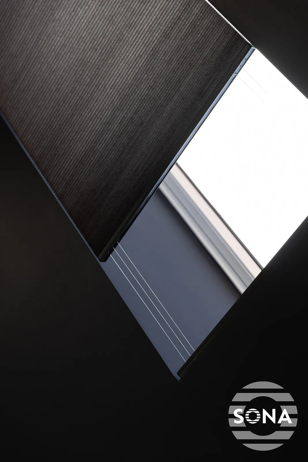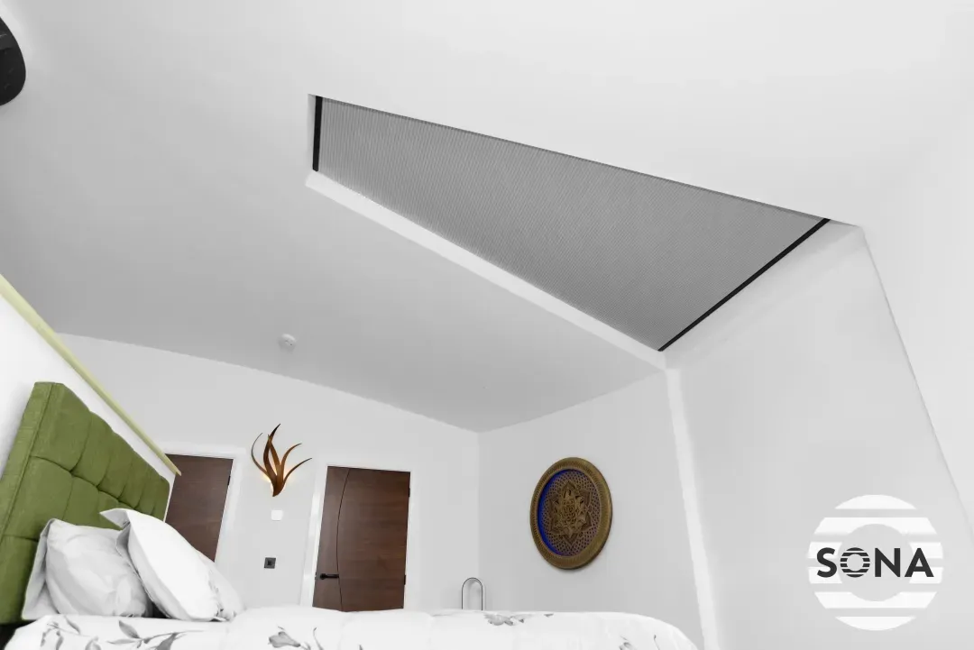 Our SonaSky electric rooflight blind system is expertly designed for bespoke sloped rooflights and velux style windows, offering a seamless solution for light and privacy control. Featuring the luxury of electric operation, SonaSky blinds can be effortlessly controlled via a handset or mobile app for ultimate convenience. Engineered with semi-transparent nylon cords to prevent fabric drooping, our system ensures smooth operation and a flawless appearance even for sloped rooflight windows.